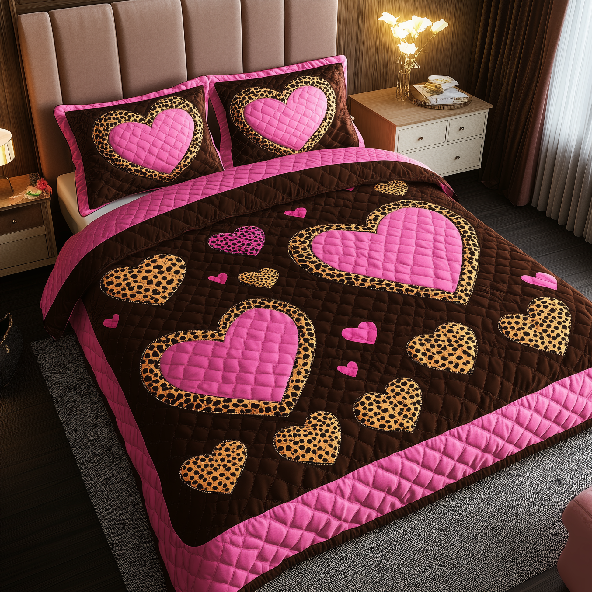Pink Leopard Heart 3-Piece Quilted Bedding Set GFTONL1696
